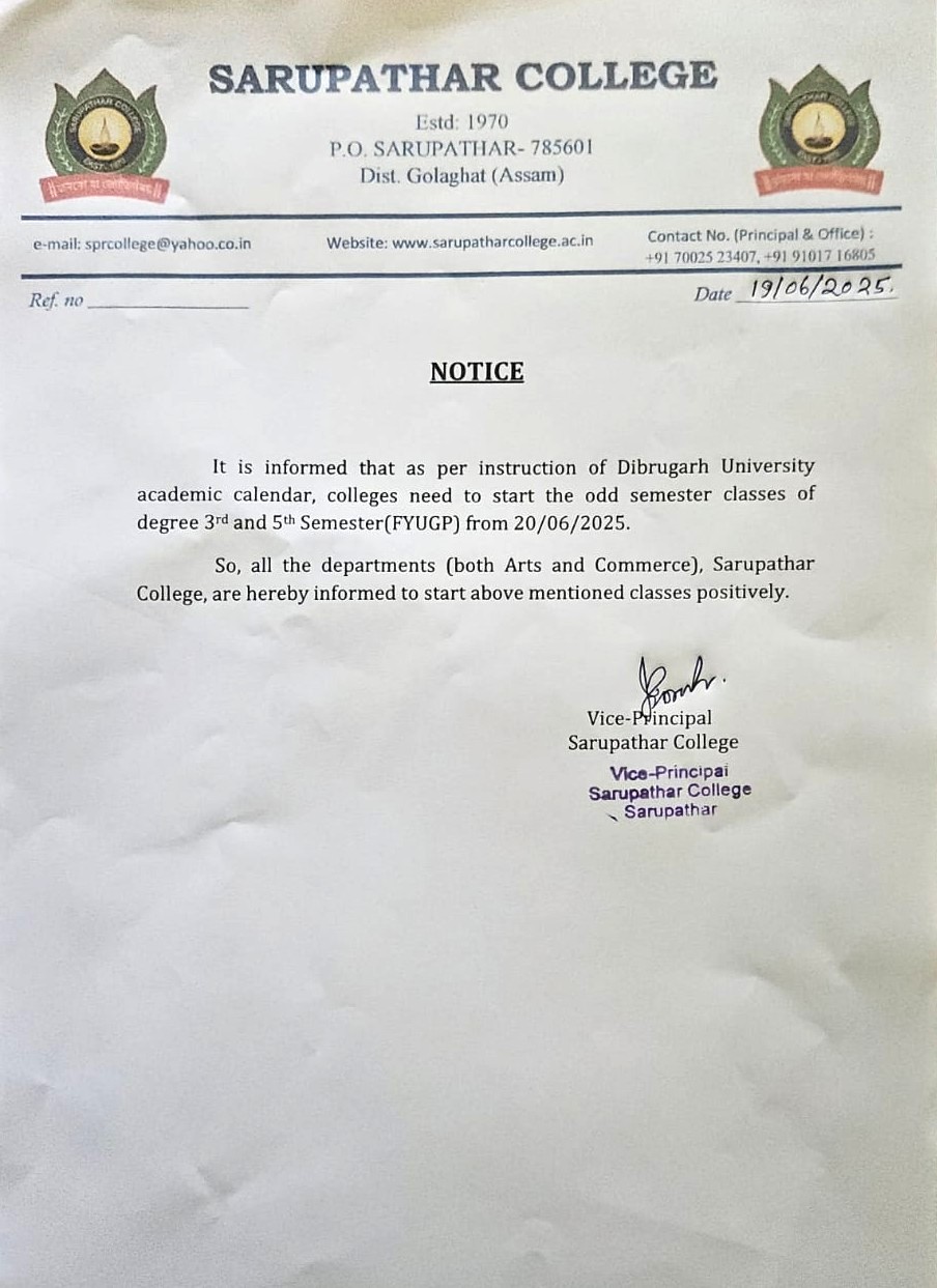 NOTICE REGARDING ODD SEMESTER CLASSES OF DEGREE 3rd AND 5th SEMESTER (FYUGP) FROM 20/06/2025